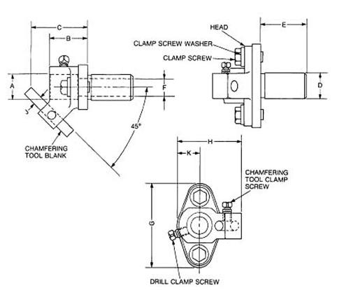 protruding from the side of the adjustable head holds the chamfering bit at a 45 degree angel to the drill.